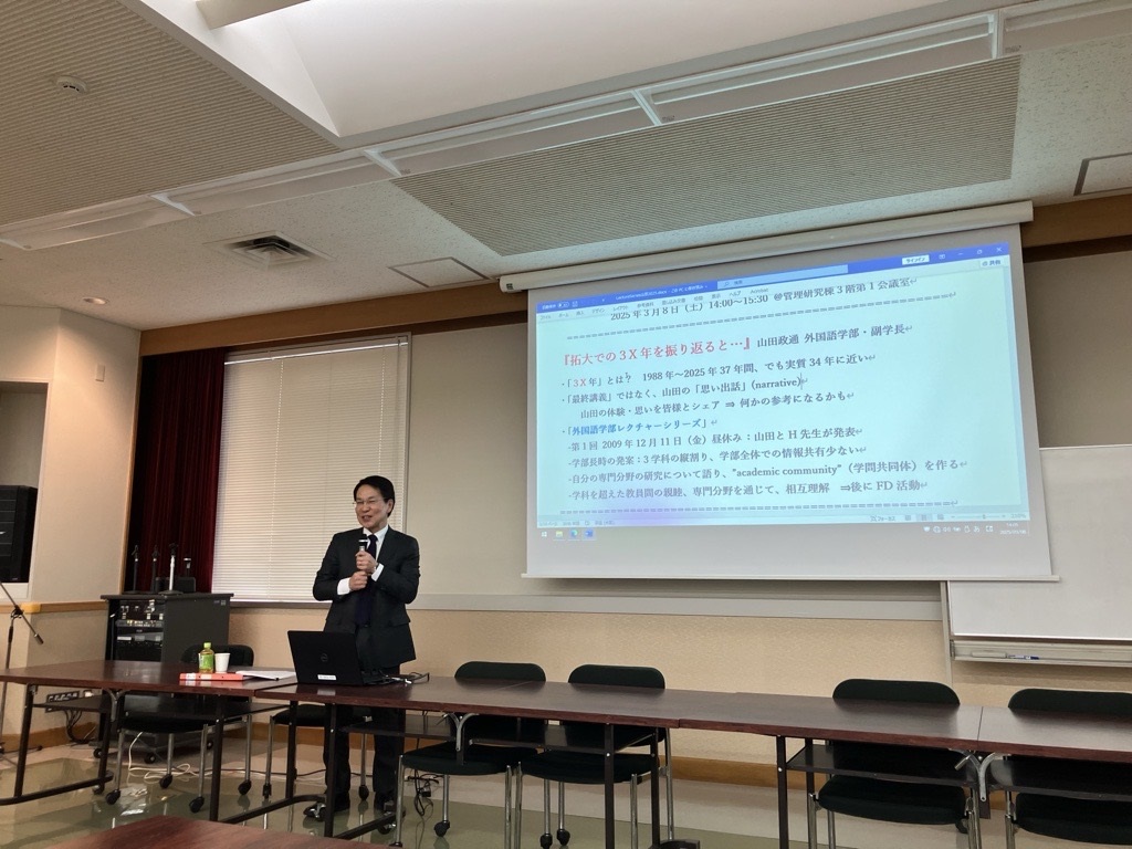 3月8日、八王子国際キャンパスにおいて、外国語学部山田政通教授の最終講義(外国語学部レクチャーシリーズ「拓大での3X年を振りかえると」)が行われました。会場には、本学教職員に加え、